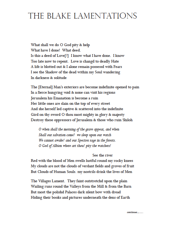 An alternative to the Lamentations of Jeremiah, this set of Lamentations to words by William Blake is intended for use on Maundy Thursday, but may be used otherwise. It sets selected words from two of Blake’s prophetic books: Vala, or The Four Zoas and Jerusalem.